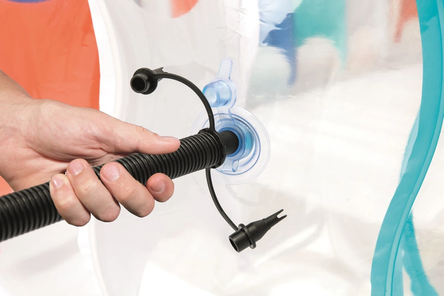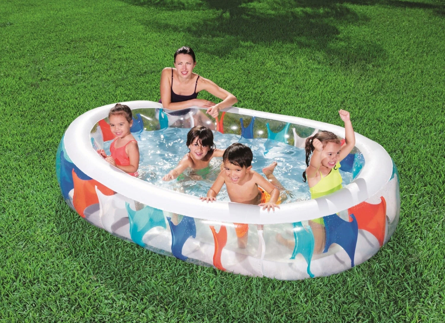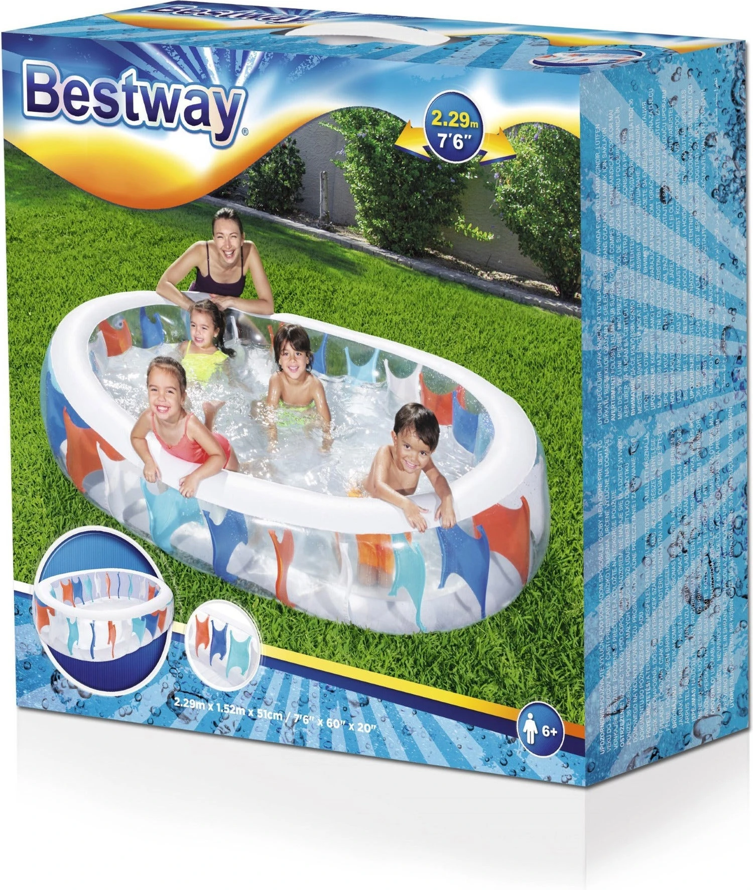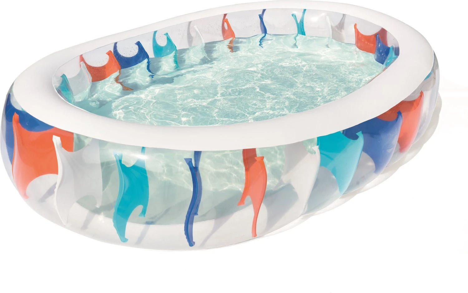 Het opblaasbare zwembad is transparant en heeft blauwe vlakken in de I-beam constructie. De afmetingen zijn 229 x 152 x 51 cm en de watercapaciteit is 542 liter. Leeftijd vanaf 6 jaar.