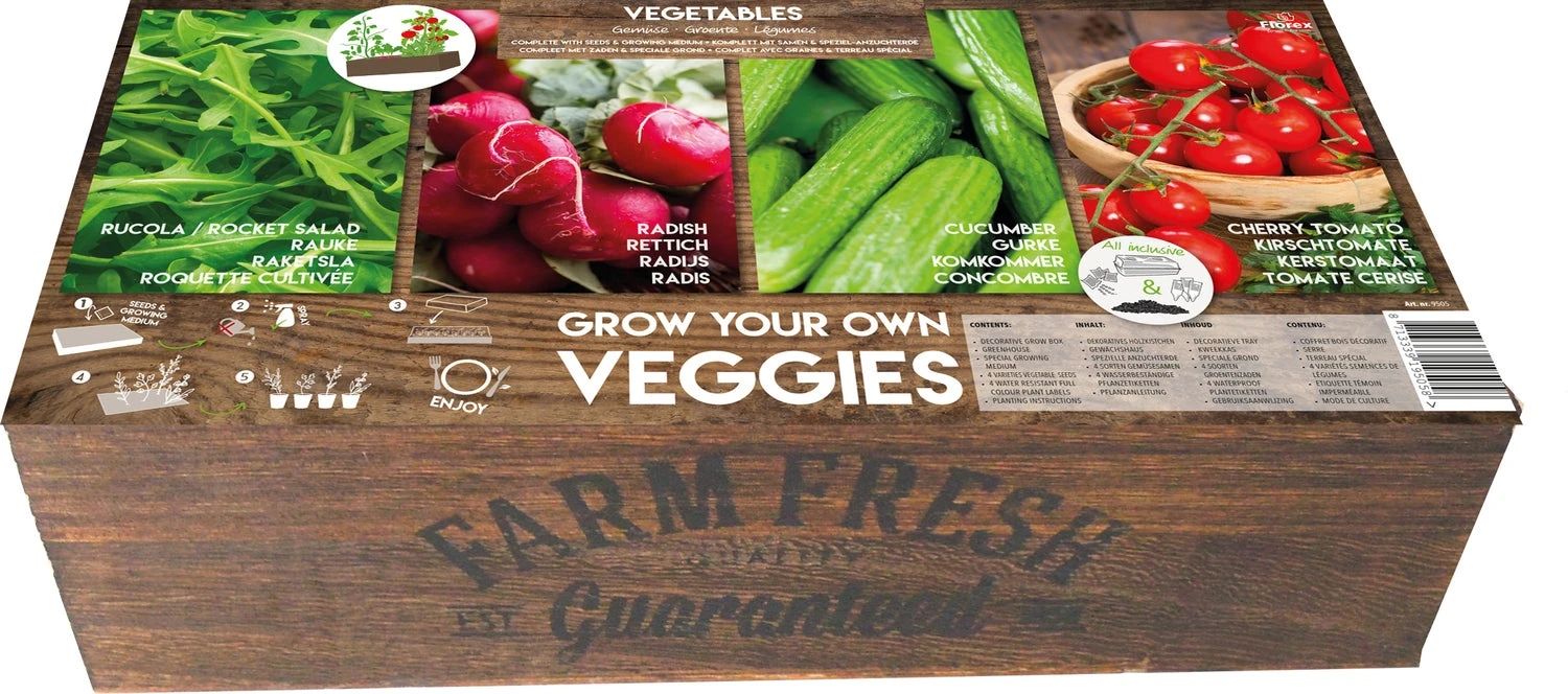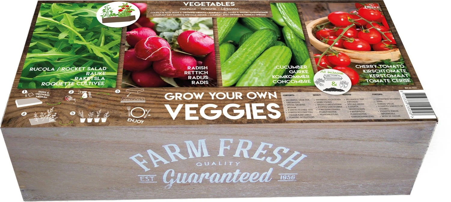 Diverse gezonde groentes om op te kweken. Farm Fresh groentebox groeien en bloeien tussen mei en oktober. De zaaitijd is van maart-april. Regelmatig vochtigheid controleren. Plaats de potjes op een lichte plaats bij een normale kamertemperatuur. (± 20°C) Organische mest met mate geven.