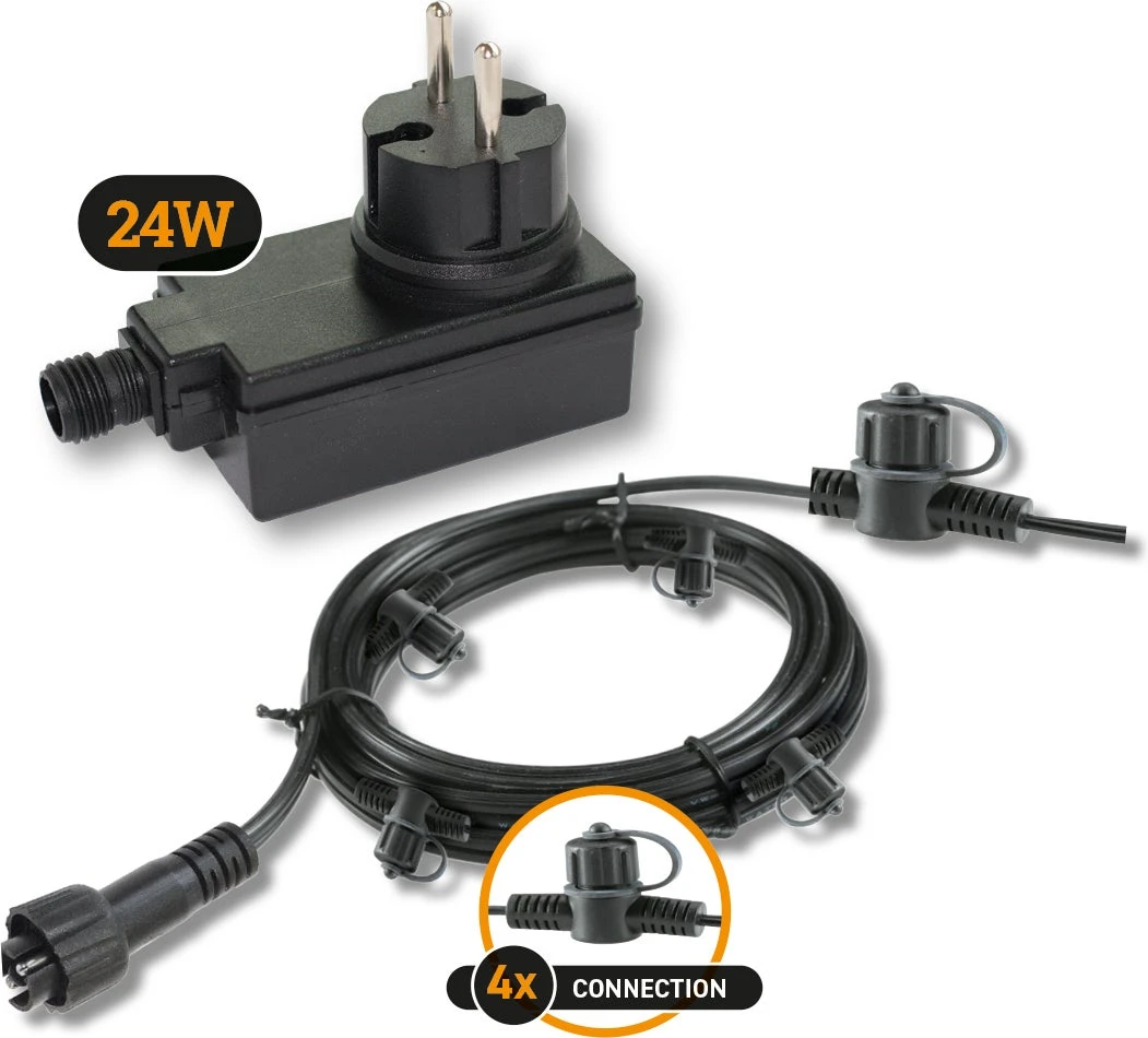 Deze 24W basisset bestaat uit een 12 V/24W transformator en een 8 meter hoofdkabel met 4 vaste aansluitingen. Een mooie basis om uw tuinverlichting aan te sluiten.