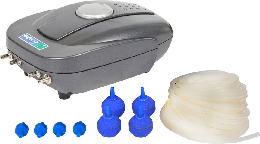 Zuurstof is onmisbaar voor je vijver, een luchtpomp is een belangrijk hulpmiddel voor het aanvullen van de zuurstofbehoefte bijvoorbeeld bij; te hoge temperaturen, te zware visbezetting of bij de aanwezigheid van algen in je vijver. Daarnaast is het een hulpmiddel om bevriezing van de vijver te voorkomen. Deze complete set voor beluchting van de vijver is geschikt voor vijvers van 6.400 liter zonder vis en 3.200 liter met kleine visbezetting en 1.600 liter met zware visbezetting.