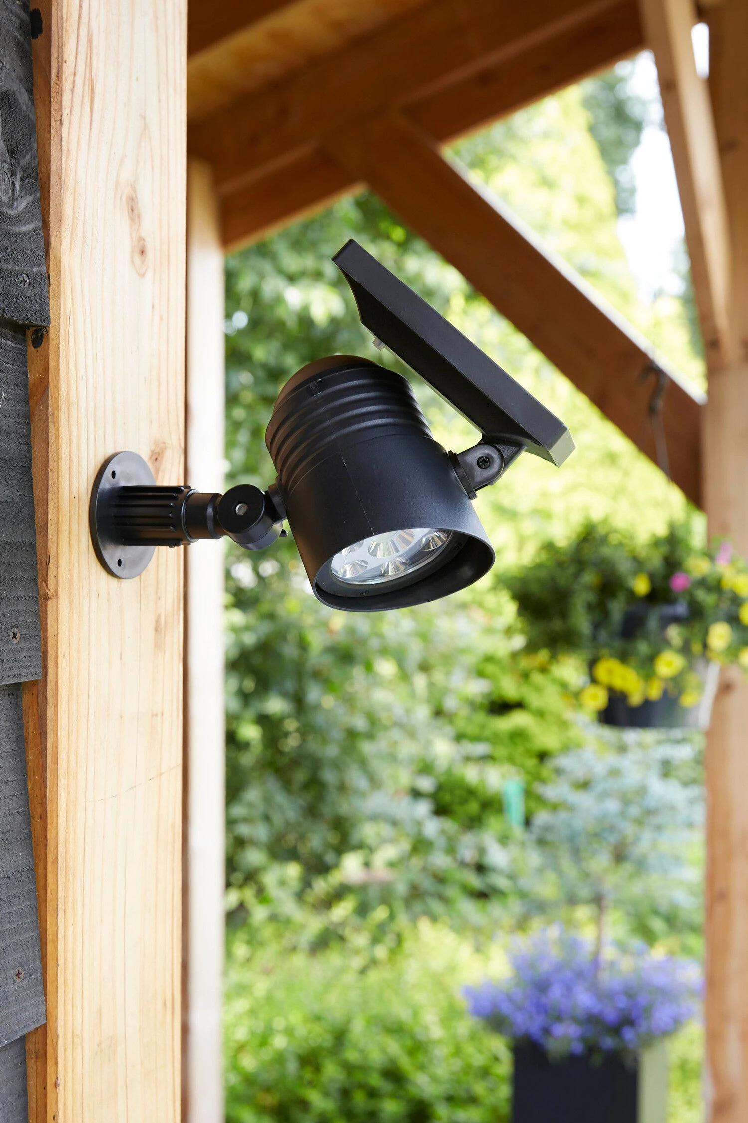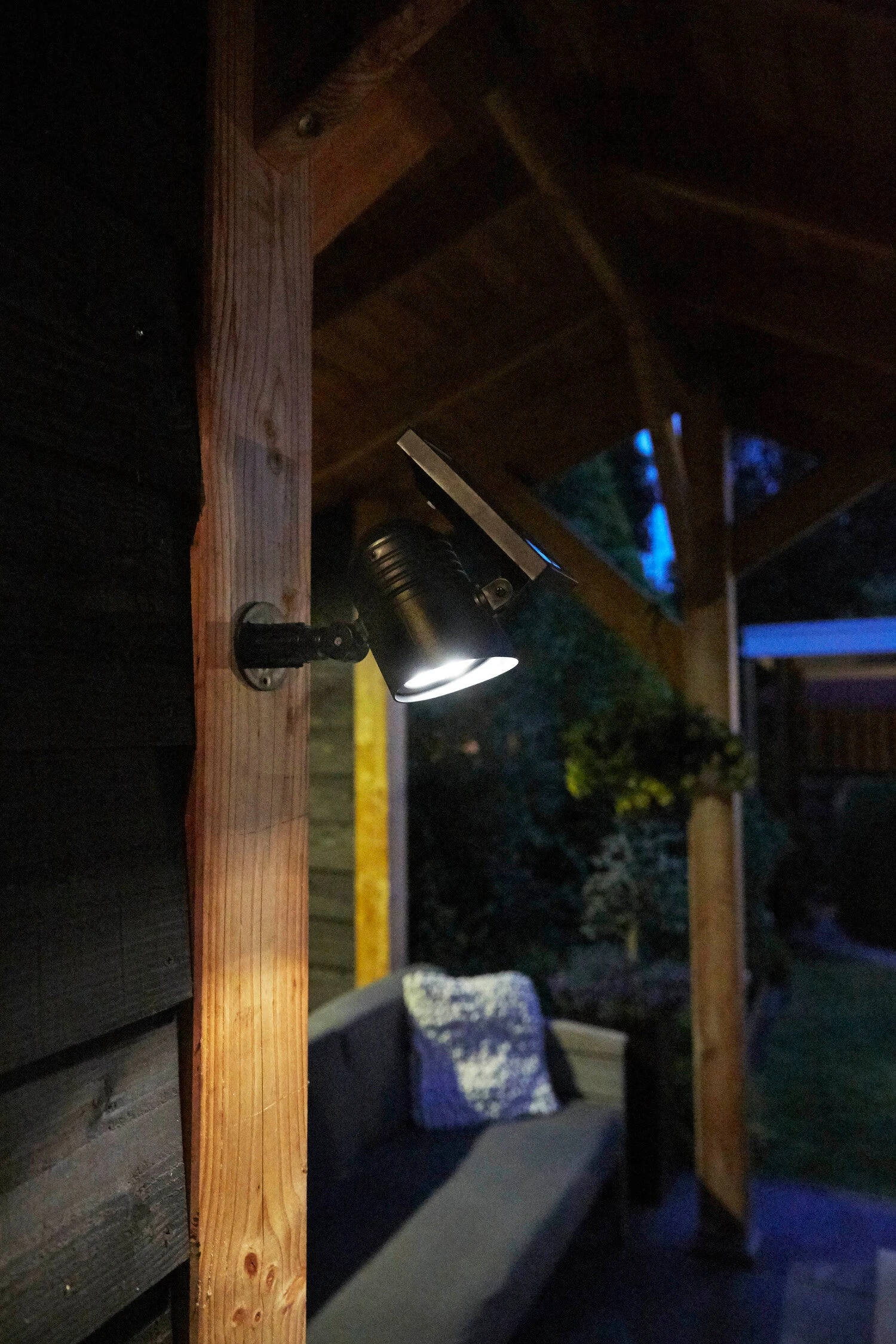 De Intelligent solar LED spotlight Lupus van Luxform is een innovatie op het gebied van solarverlichting. Deze lamp blijft namelijk in de winterperiode langer branden in vergelijking met traditionele solar lampen! Met zijn Intelligentie Chip is de lamp in staat om zijn lichtopbrengst aan te passen aan de geladen energie van die dag. In de zomerse periode zal de lichtopbrengst maximaal zijn gedurende 8 branduren. In de winterperiode zal de lichtopbrengst dimmen, zodat de lamp voor een langere periode licht geeft. Dit model is voorzien van 7 warm witte LED lampen met een lichtopbrengst van maar liefst 50 lumen. Zowel het solar paneel als de lamp zijn kantelbaar. Hierdoor kan het paneel de zon en het daglicht optimaal opnemen, en de lamp op de gewenste hoogte gericht worden. De grondspies zorgt ervoor dat de lamp eenvoudig in de tuin te plaatsen is. Tevens kan de lamp met behulp van de voetplaat en schroeven op een harde ondergrond bevestigd worden. Solar verlichting van Luxform Lighting is de snelste, veiligste en gemakkelijkste manier om ’s avonds sfeer in jouw tuin te brengen. Elke lamp bevat een ingenieus ontworpen zonnepaneel dat zonlicht omzet in elektrische energie. Deze energie wordt opgeslagen in een oplaadbare batterij, die ’s avonds zorgt voor de benodigde energie. Tip: Plaats de lamp overdag op een zonnige plaats, zodat de batterij optimaal geladen kan worden.