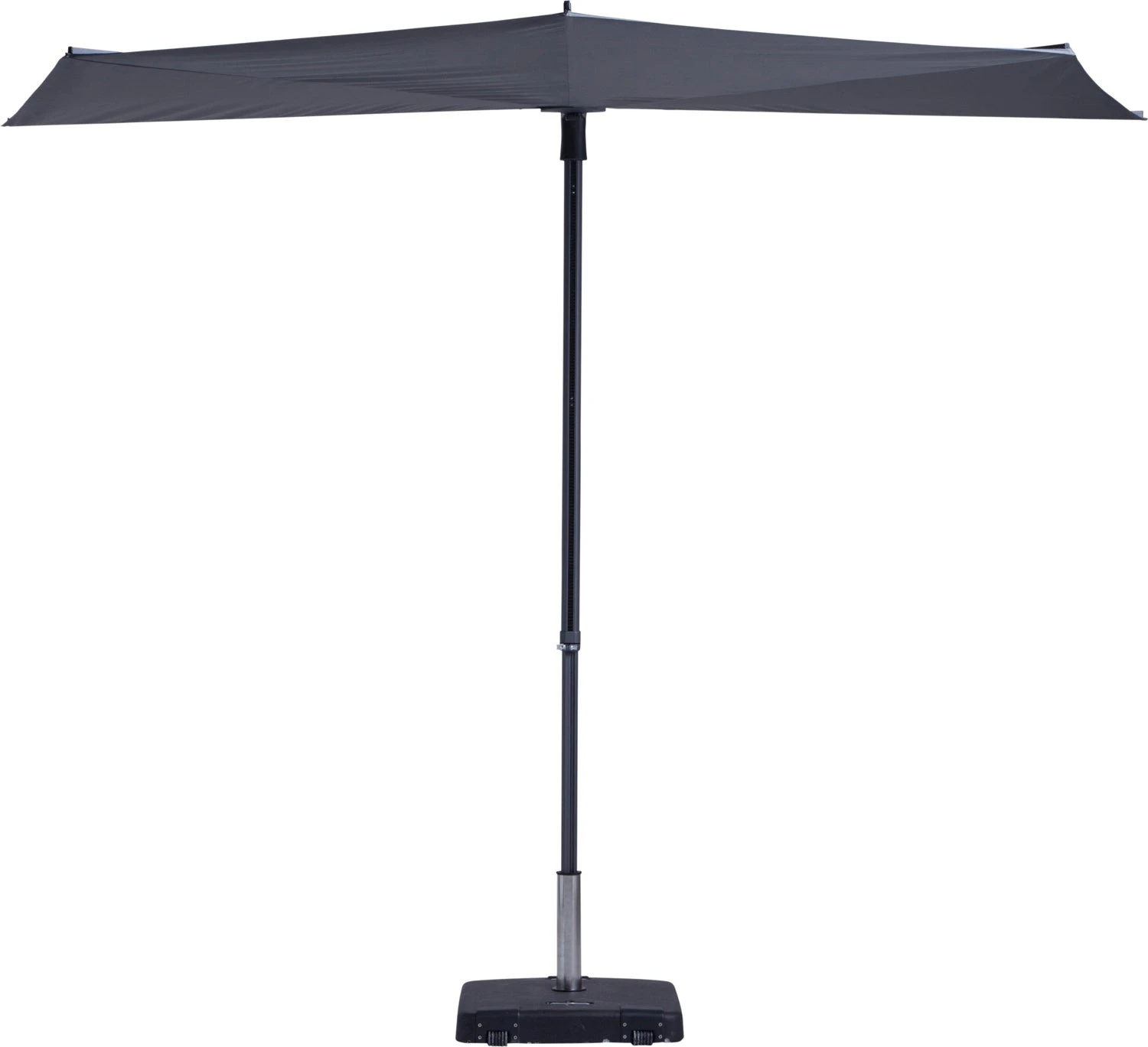 Deze luxe waaiervormige parasol kan in meer dan 80 standen worden ingesteld en heeft een doek van 100% polyester in de kleur grijs met een beschermende PA coating. Deze coating zorgt voor een kleurvastheid van 2000 zonuren. Ook is het doek UV-bestendig met beschermingsfactor 50+ voor een optimale zonbescherming en licht waterafstotend. Afmetingen 300 x 150 centimeter.