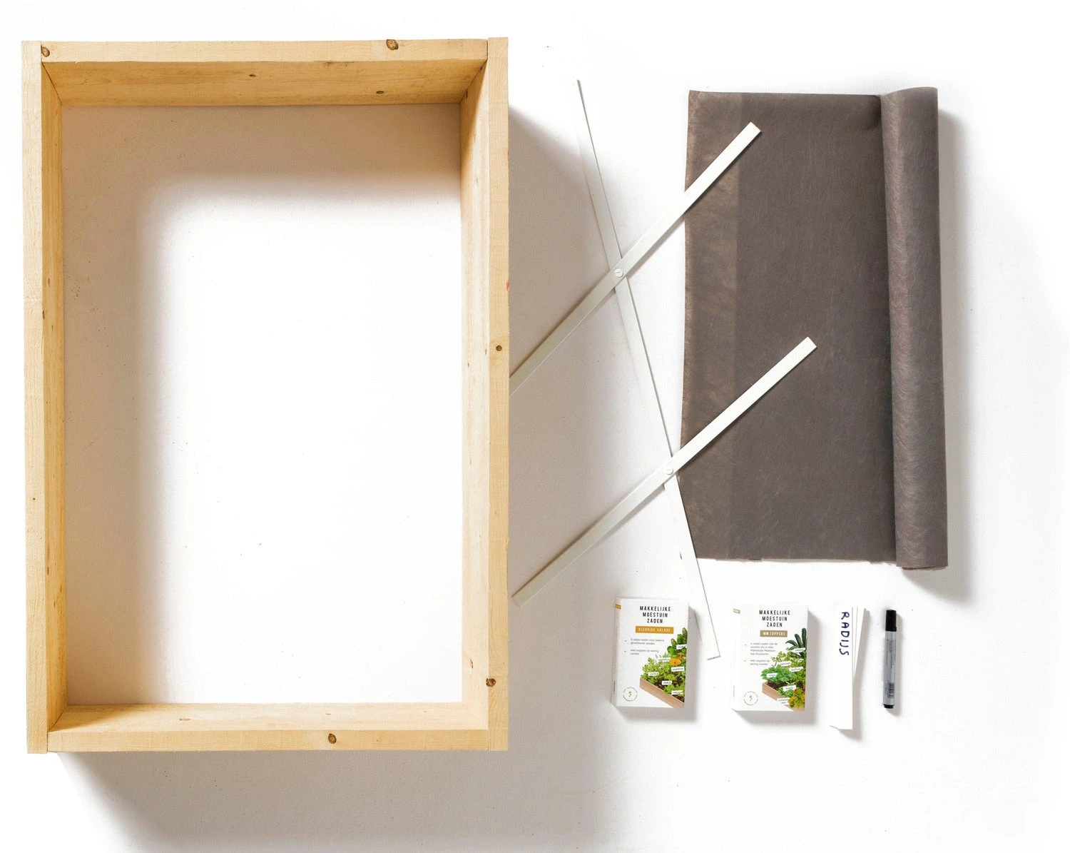 Het startpakket is een bak van 60 x 90 cm, inclusief raster, anti-onkruiddoek, 10 labels met stift en 12 zakjes zaden.