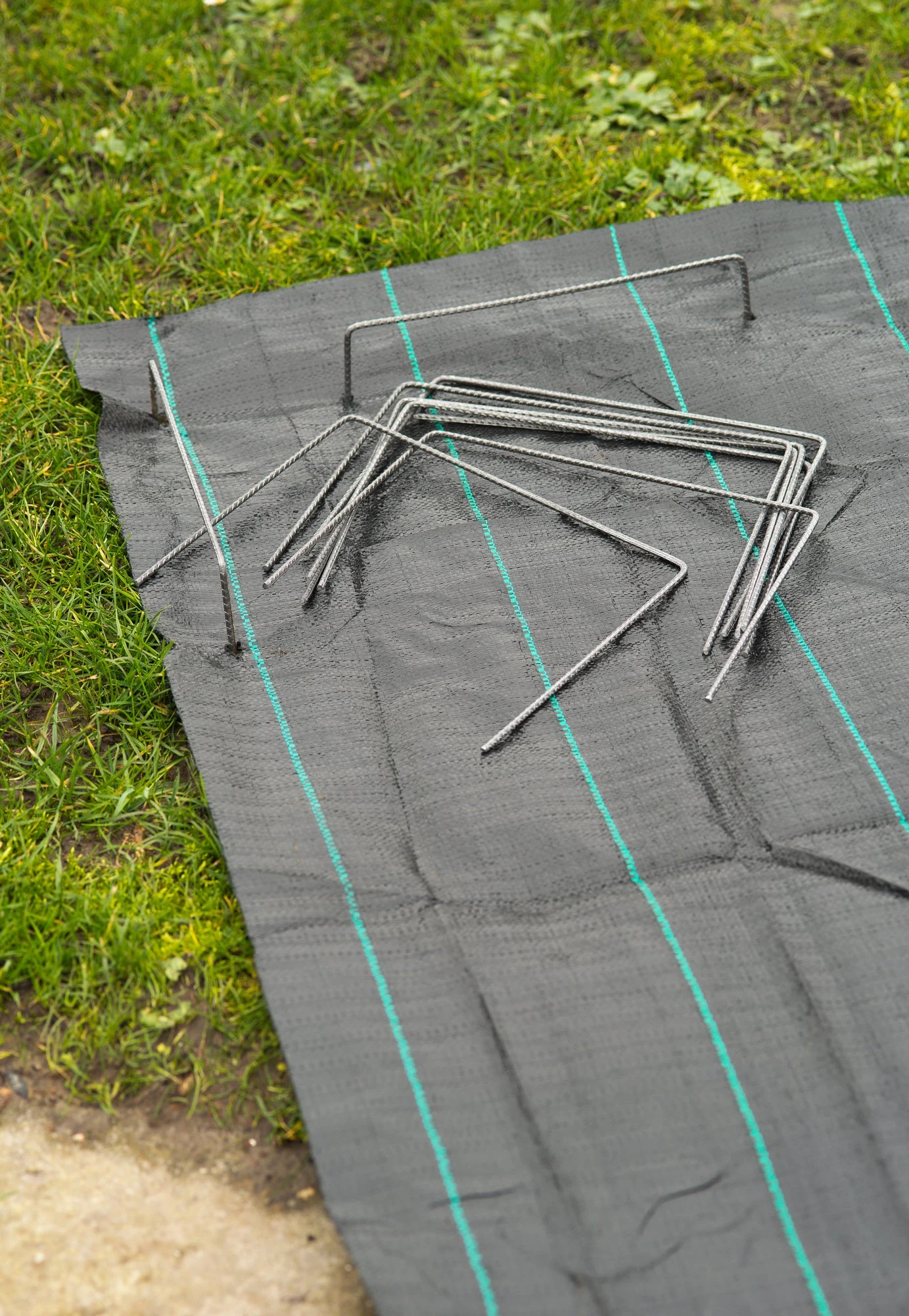 Set metalen gronddoekpennen voor het vastzetten van gronddoek en dergelijke. Afmeting: H 20 x 25 cm x Ø 4 mm. Verpakt per 20 stuks.