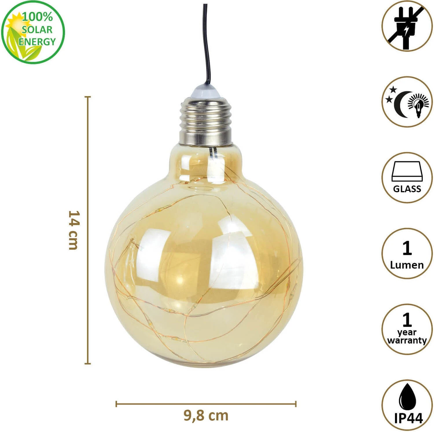 Deze O’Daddy solar buiten hanglamp is erg leuk om jouw tuin of terras mee te verlichten en zorgt voor een gezellige sfeer. De sfeerverlichting kan je eenvoudig installeren zonder bedrading aan te leggen. De hanglamp is voorzien van een snoer met aan het uiteinde een solar paneel. Zo kan je het solar paneel plaatsen op plekken waar deze de meeste zon vangt. Ook heeft de buitenlamp een aan- en uitknop. Schakel de lamp overdag uit om zo de batterij in het zonlicht op te laden. De oplaadtijd bij helder zonlicht is circa 7 à 8 uur. Wanneer het donker wordt, zullen de lampje automatisch gaan branden (als de knop op aan staat) door middel van de schemersensor. In de glazen lampenkap zit een snoer met 10 LEDs van 1 Lumen (circa 0,10 W). De buitenverlichting is gemaakt van glas, kunststof en RVS en heeft de kleur geel. De hanglamp heeft een diameter van 9,8 cm en een hoogte van 14 cm exclusief snoer. De totale lengte van de lamp inclusief snoer is 73,5 cm.
