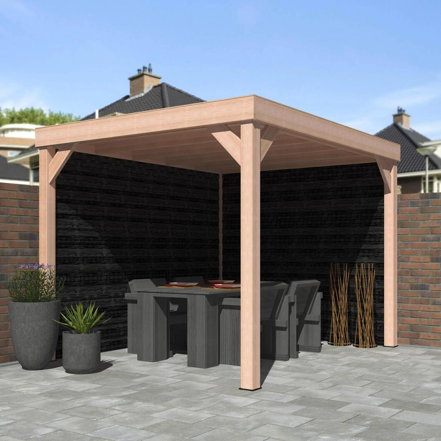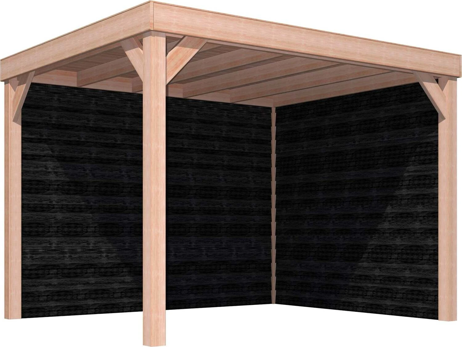 Deze houten overkapping heeft afmetingen van 270 x 330 x 247 cm en wordt geleverd inclusief EPDM-folie voor een waterdichte dakbedekking. Het totaalpakket staat extra stevig dankzij de achterwand, zijwand en de 12 x 12 cm Douglas palen.
