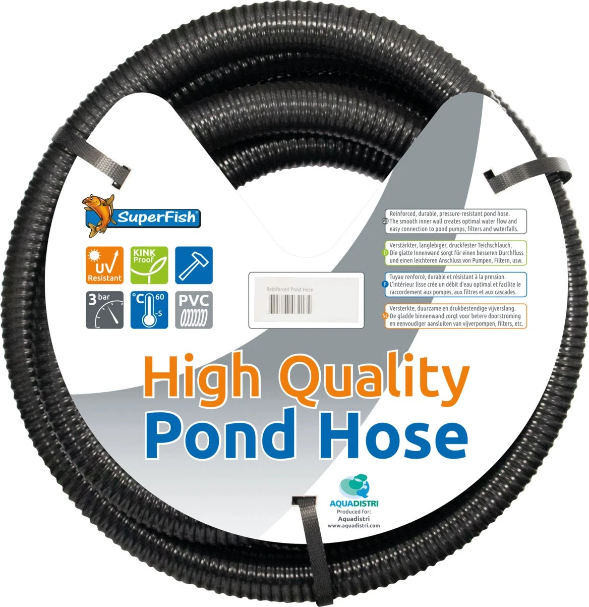 Deze gewapende vijverslang van Superfish heeft een gladde binnenwand en is van hoge kwaliteit. Geschikt voor het gemakkelijker aansluiten van vijverpompen op vijverfilters, watervallen en waterfiguren. De slang heeft een diameter van 38 mm en is 5 meter lang.