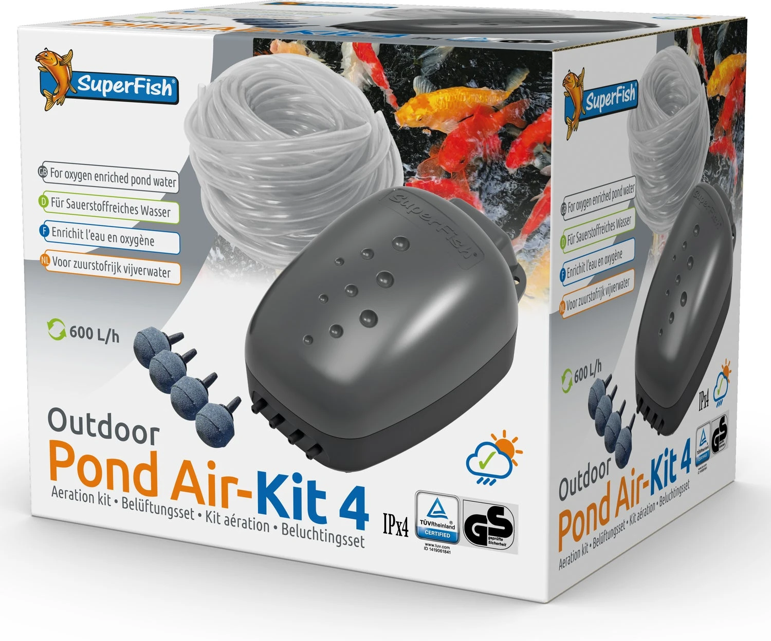 Vijver luchtpomp Kit 4 van Superfish is een set voor de beluchting van de vijver voor gebruik buitenshuis. De luchtpomp heeft een kabel van 2,5 meter. De luchtslang is 25 meter en er zitten 4 luchtstenen (ø 25 mm) bij. Voorzien van een ophangoog waardoor verticale plaatsing mogelijk is. Waterbestendig (IP x4) en TÜV-GS gekeurd met 2 jaar garantie.