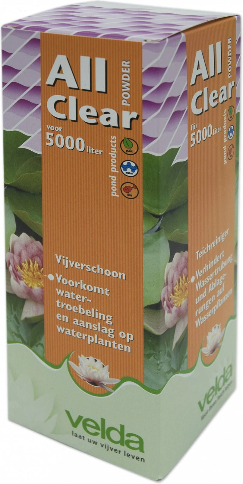 All Clear poeder van Velda bindt fosfaat in de vijver en neemt zo een belangrijke voedingsbron weg. Het is een natuurlijk middel dat preventief werkt, watertroebeling en aanslag op waterplanten wordt voorkomen.