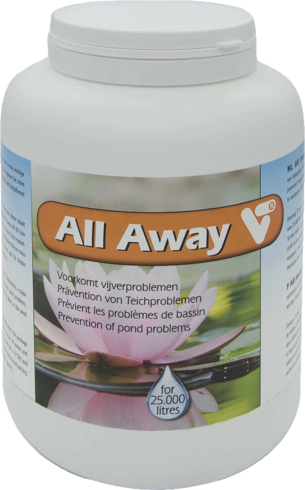 All Away van VT bindt fosfaat in de vijver en neemt zo een belangrijke voedingsbron weg. Dit natuurlijke middel werkt preventief, begin het gebruik al vroeg in het jaar om problemen te voorkomen. Geef de vijverplanten weer ruimte om te groeien.
